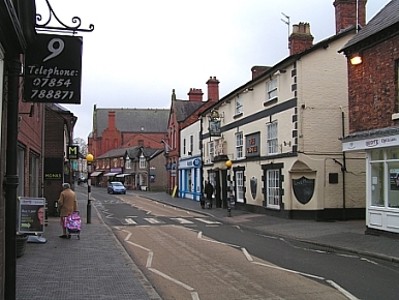 ![]() Wem High Street: Barclays Bank and The Castle (rhs) with the Town Hall further on, |